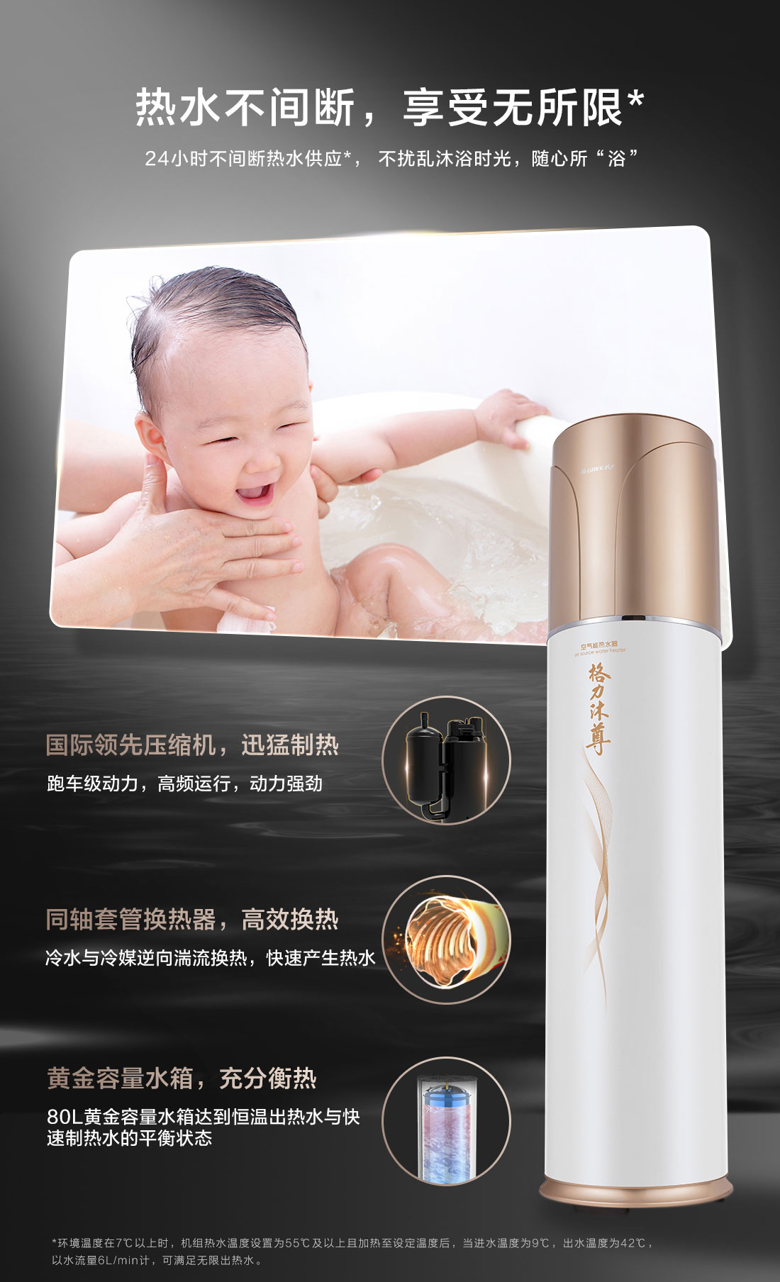 24小时不间断热水供应,恒温热水随时享用,且搭载特有采暖系统,一机两用,满足您的热水需求和采暖需求